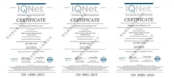 2020年6月份,公司順利通過ISO9001質量體系認證,公司質量認證體系的完善,提高了公司在阻燃劑產品知名度和產品質量意識。